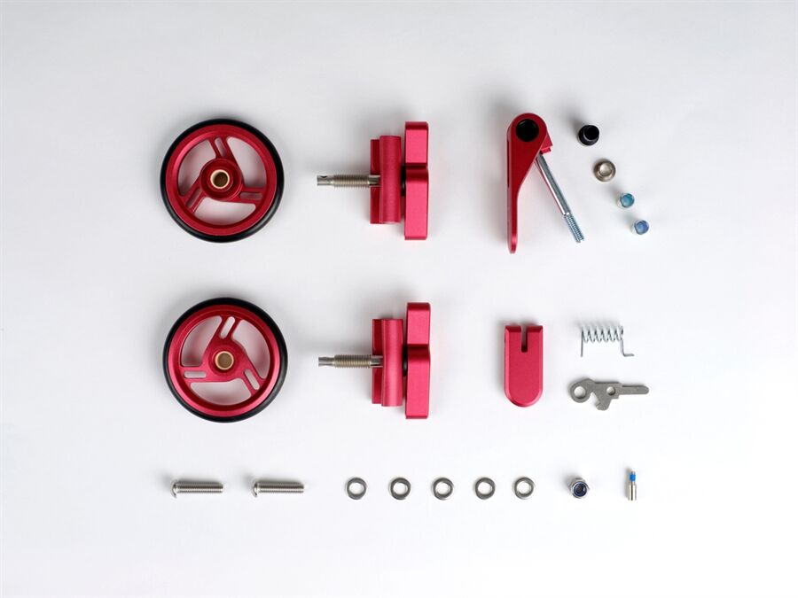 LieferumfangDas fünfteilige Set enthält: 2x Scharnier-Klemmhebel, 1x Sattelschnellspanner, 1x Hinterer Rahmenclip, 2x Roller Wheels Ø 66 mm